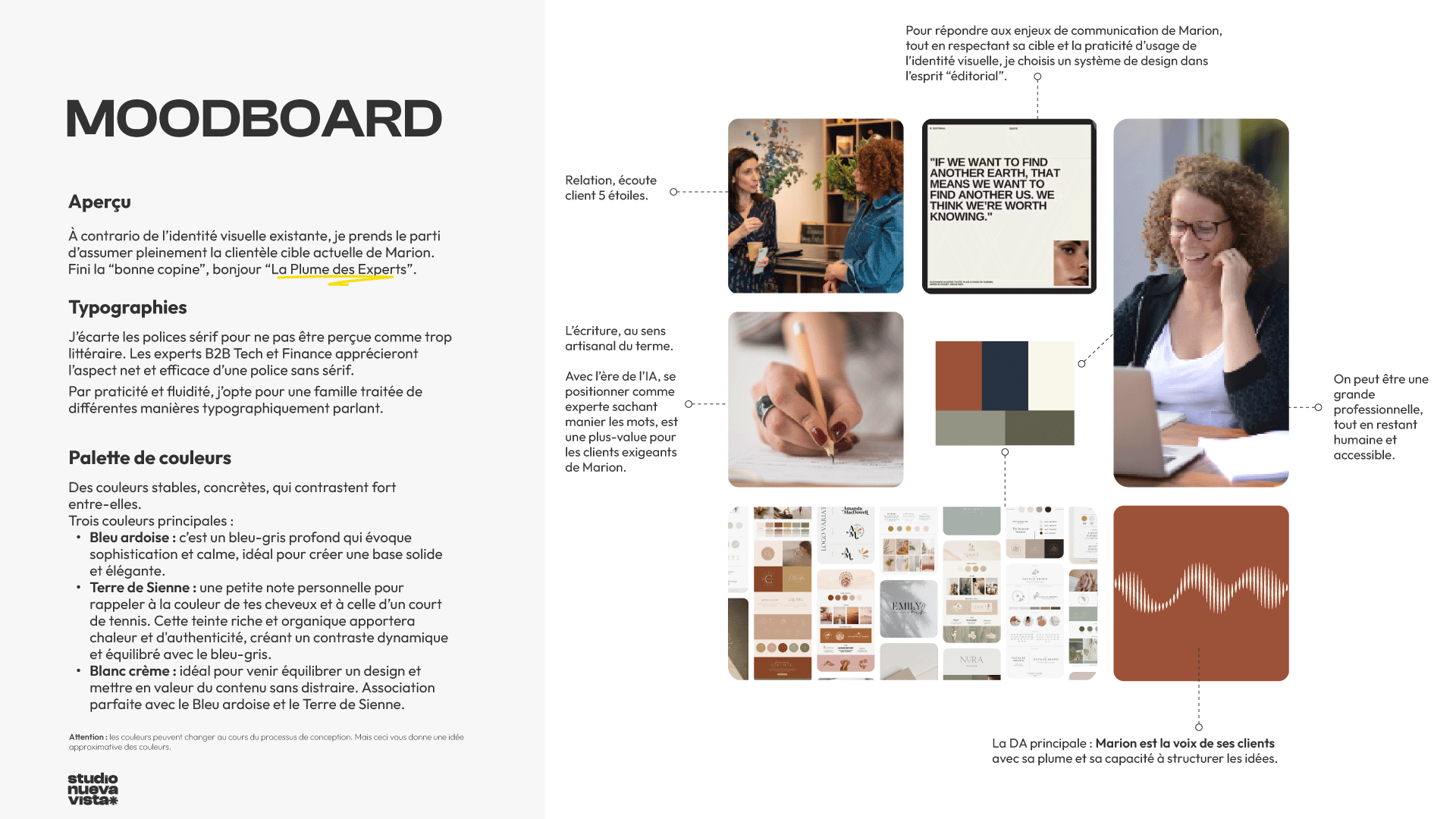 Son identité visuelle ne colle plus à cette nouvelle direction. Elle ne se reconnait plus dans ses visuels. Elle a l’impression que son image renvoie quelque chose de trop léger, trop “bonne copine”, pas à la hauteur de son expertise.