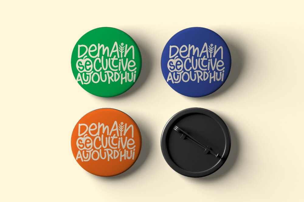 Le nom du village est fort : “Demain se cultive aujourd’hui”. Je m’oriente donc vers un lettrage vivant, avec des couleurs vives et naturelles, pour évoquer l’agriculture en mouvement.